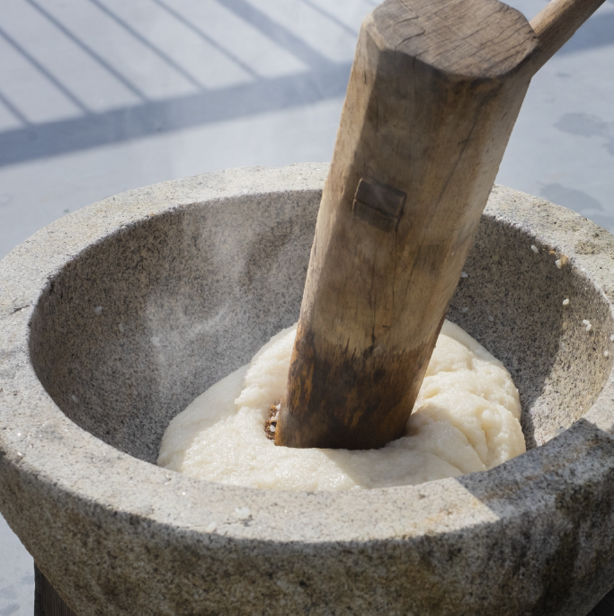 すべてのお餅を、昔ながらの杵と臼を使った手作業で丁寧につき上げています。機械任せにせず、こがねもち本来の風味と食感を引き出す製法です。